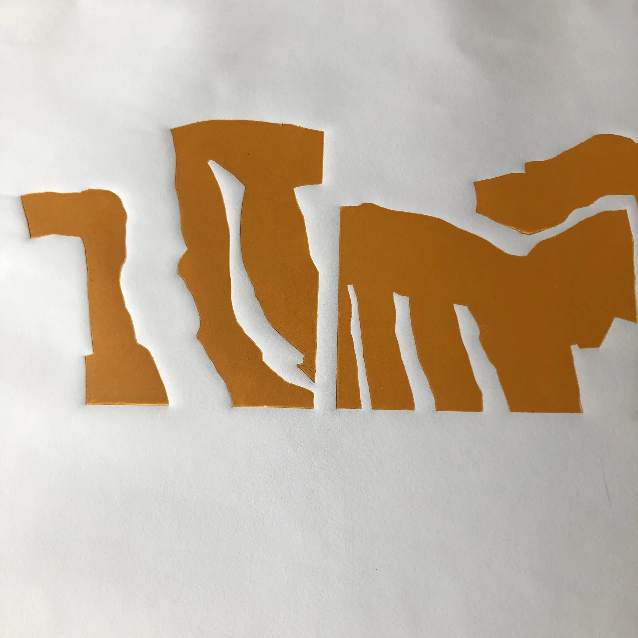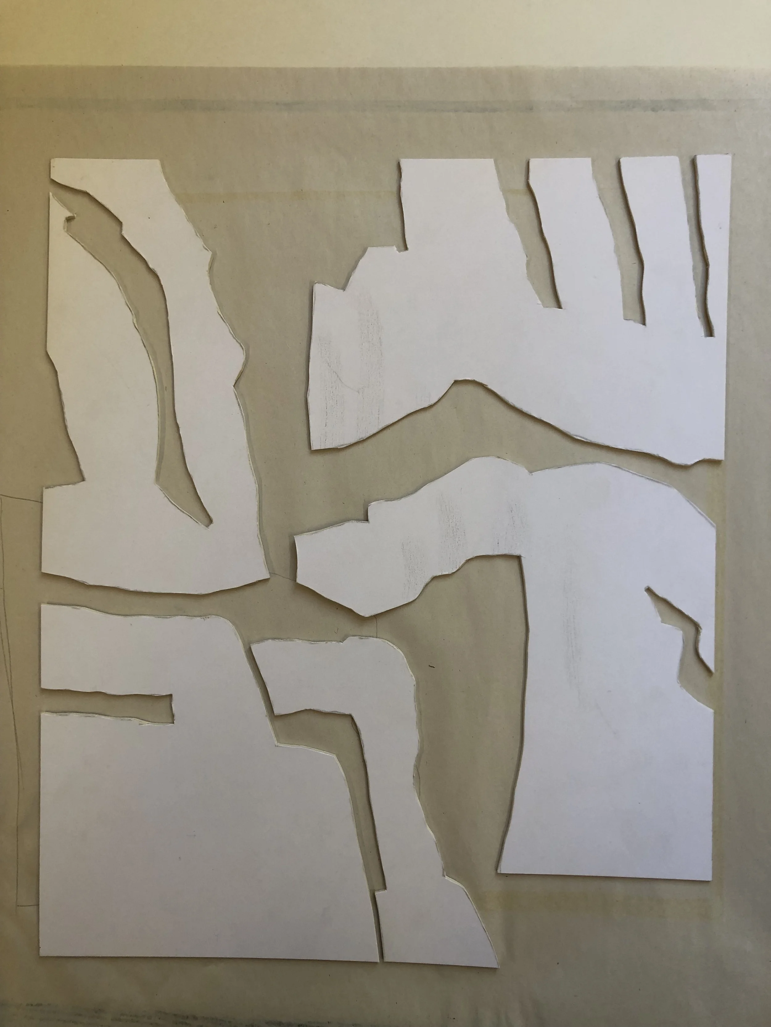 These are the original ink sketches on paper, done with a broad, flat brush, working quickly, intuitively, as I contemplated/remembered walking through Kalimna forest near Castlemaine….working from the body memory of the place: the rough, rocky paths, winding my way through heavily coppiced Box-Ironbark forest degraded by decades of gold-mining in the 19th century….